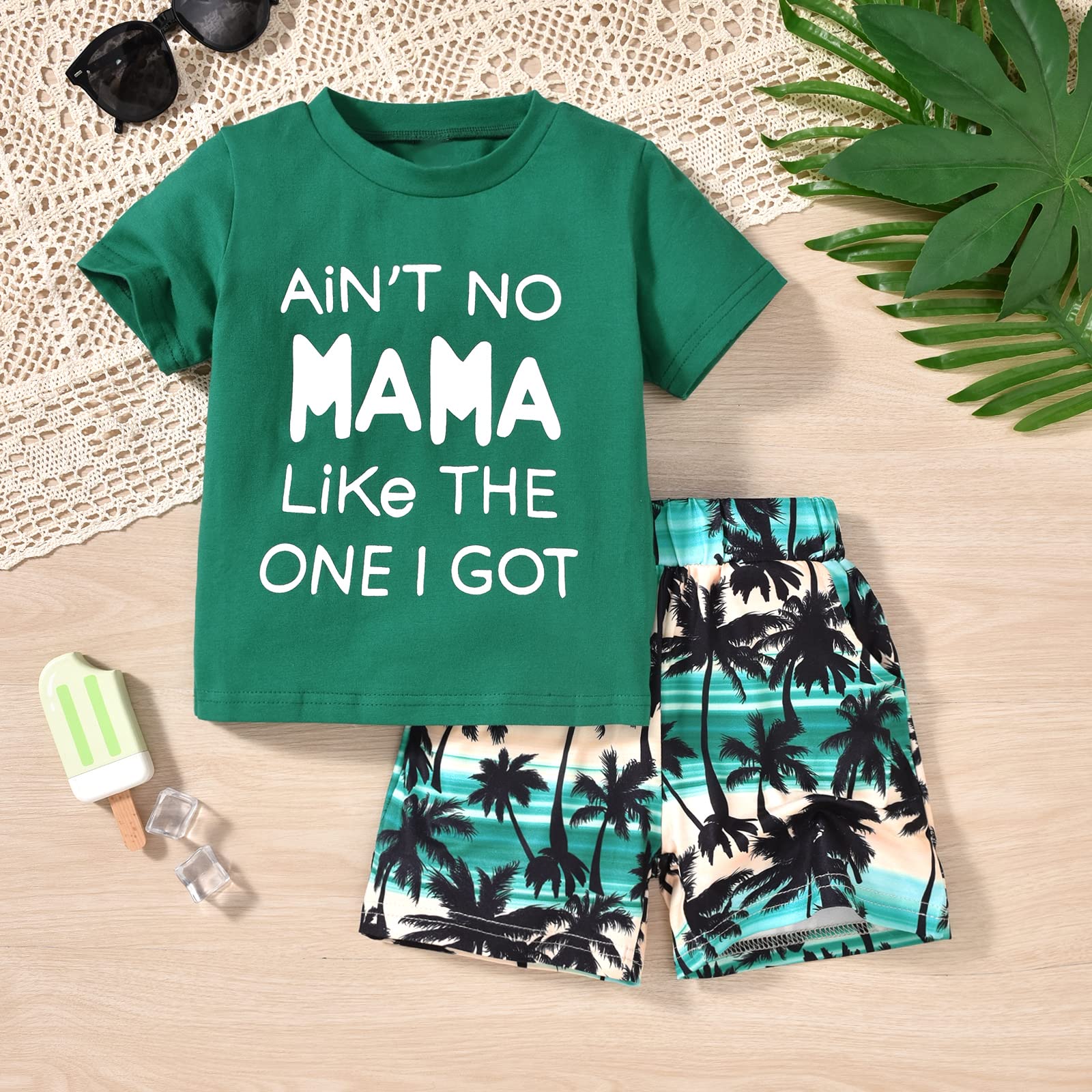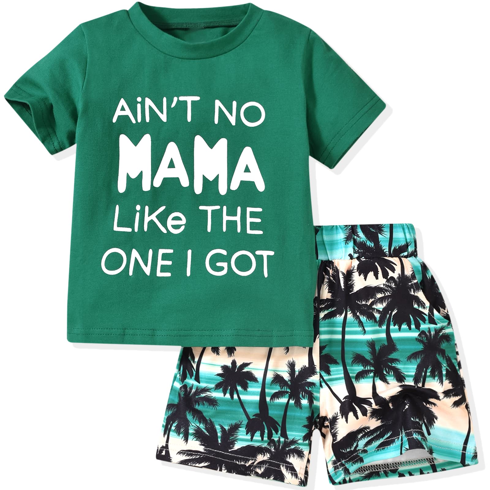 - Cute Funny Design: crewneck, short-sleeve with funny adorable letter print on the top of the shirt. Elastic waistband on camouflage shorts, good matching the top. Made with quality cotton material that protects your little kid's sensitive skin. Get it for your boys in hot Summer!